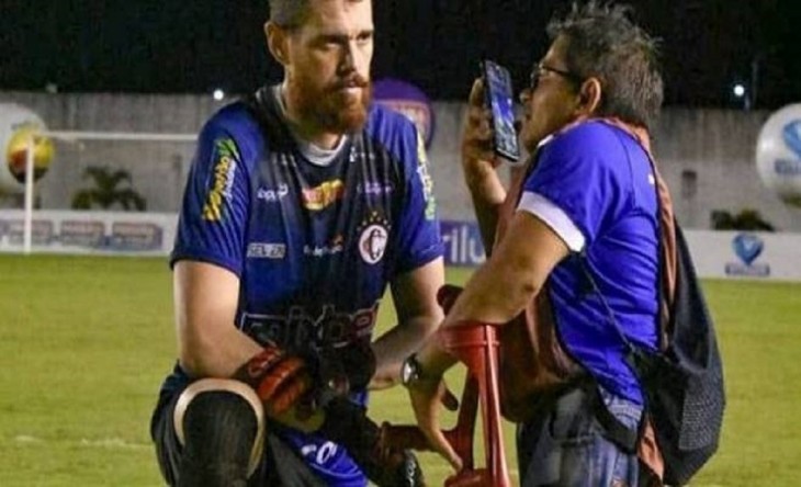 Goleiro Coradin se ajoelhou para conceder entrevista a repórter Rogério Roque.
