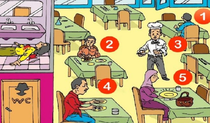 Analise a imagem e descubra qual dos suspeitos matou a mulher que está caída no banheiro.