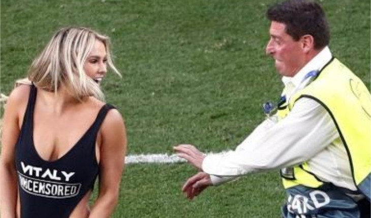 A loira chamou a atenção de todos e deu muito trabalho para os seguranças, que custaram tirá-la de dentro do campo.