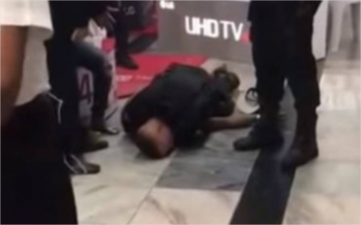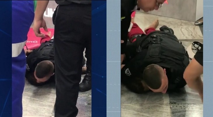 Vídeos mostram já imobilizado, mas o segurança continuou sobre ele, mesmo com as pessoas próximas pedindo para ele soltar o jovem.