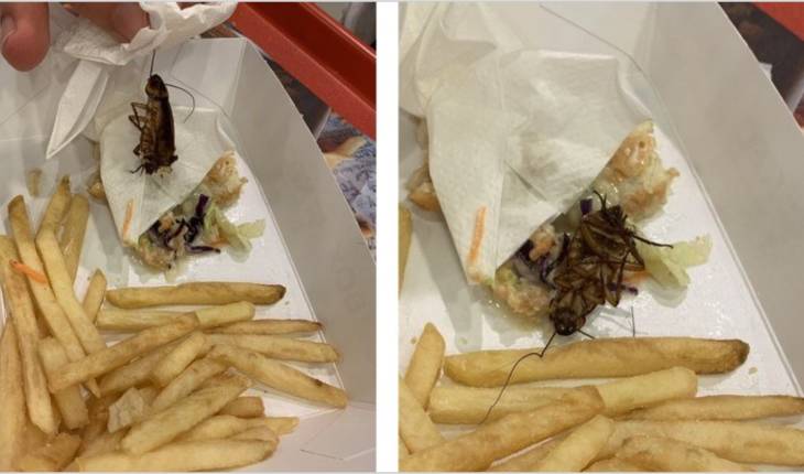 O cliente ficou chocado quando encontrou uma barata inteira dentro do lanche e reclamou com a gerência.
