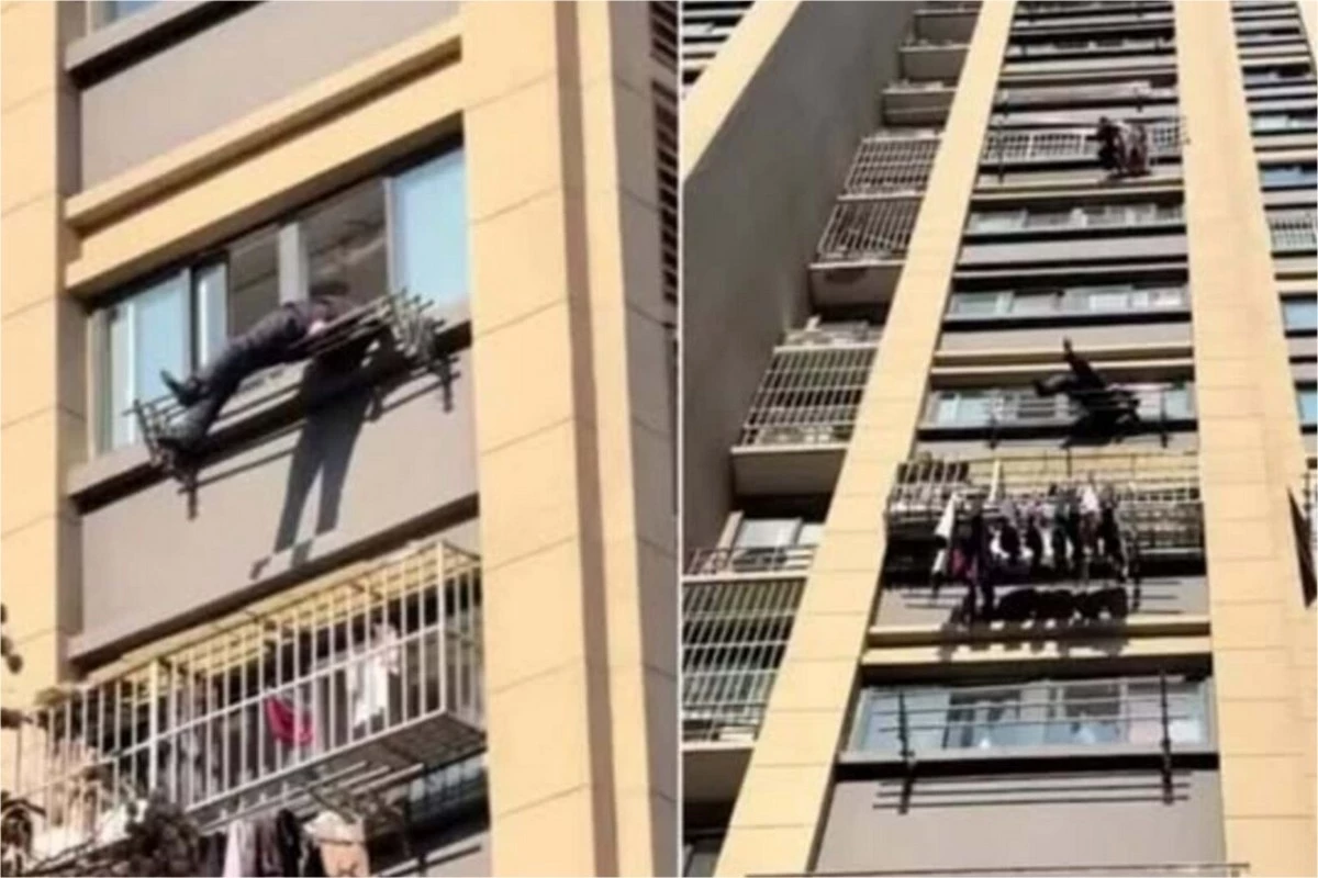 O varal metálico estava no sétimo andar e por isso o homem não morreu na queda.