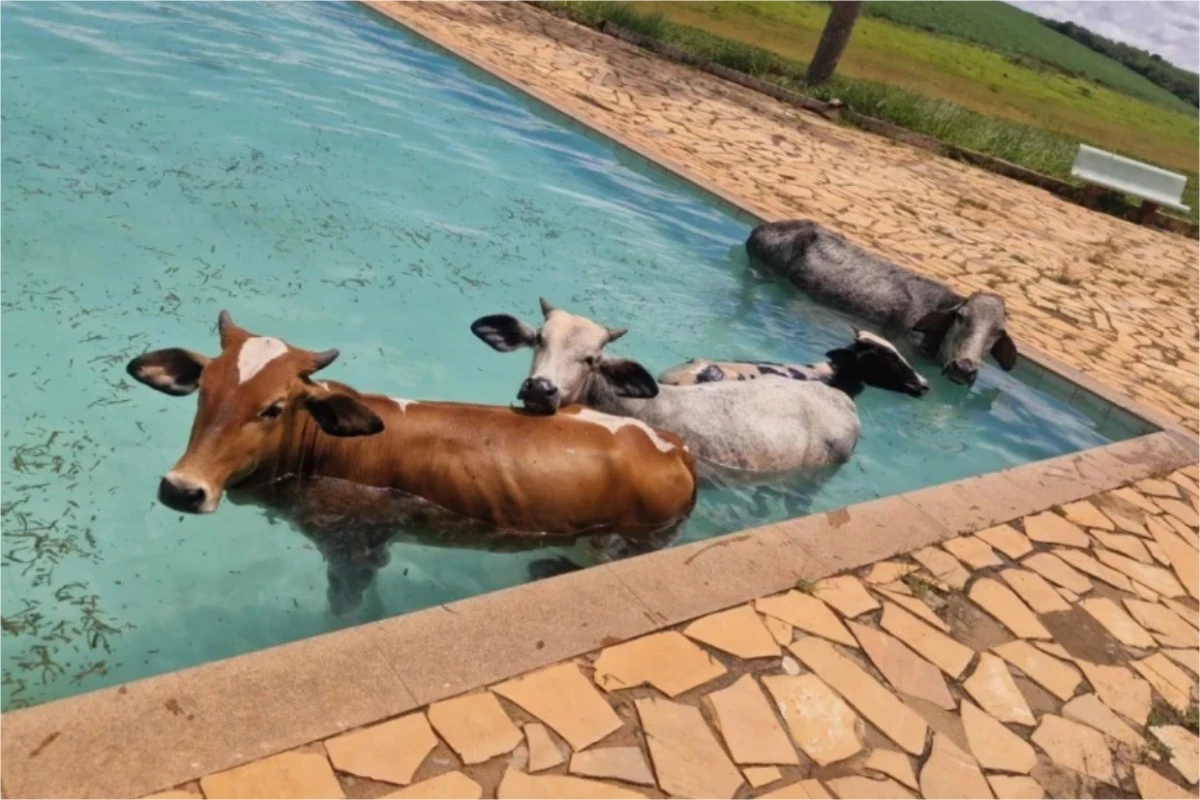 O Corpo de Bombeiros foi acionado para retirarem os animais da piscina e as imagens viralizaram.