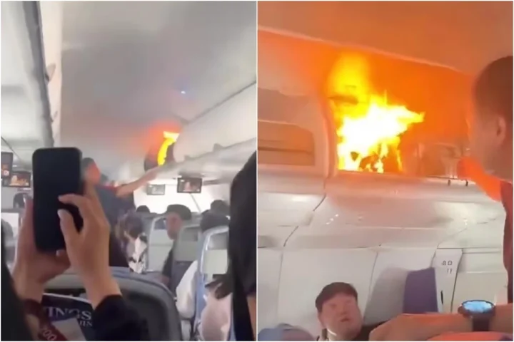 Vídeo mostra incêndio em compartimanento de bagagem do avião de empresa asiática.