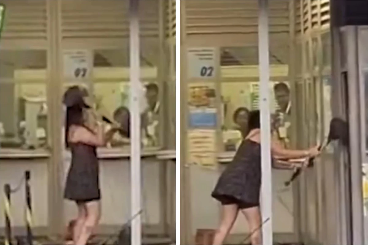As imagens mostram a mulher usando um organizador de filas para atacar a lotérica.