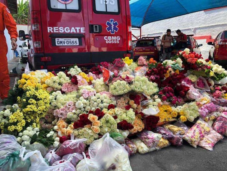 Do helicóptero, homens do corpo de bombeiros lançaram flores sobre o local da tragédia da Vale.