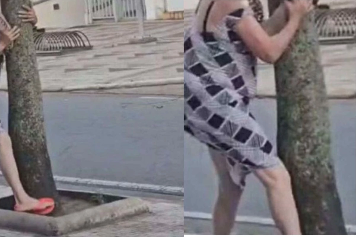 As imagens mostram a mulher agarrada a uma árvore ao ser surpreendida pela ventania.