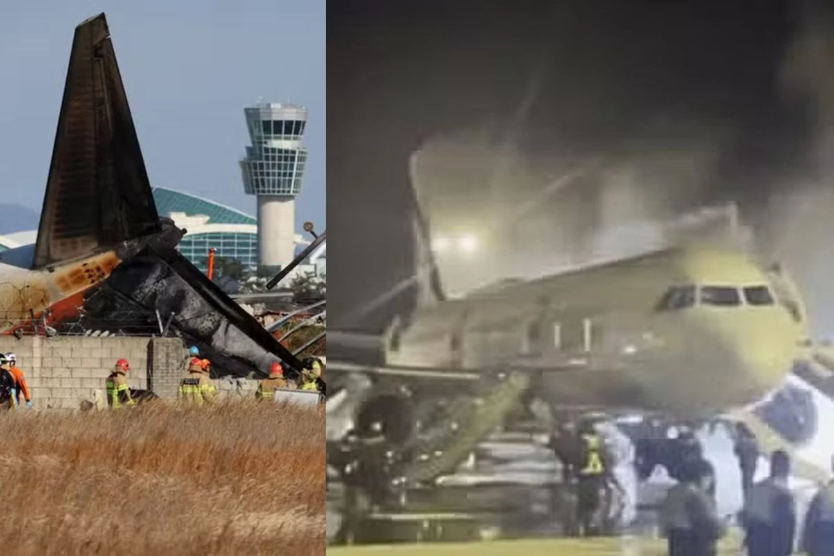 Bombeiros agiram às pressas após cauda de avião pegar fogo em aeroporto da Coreia do Sul.