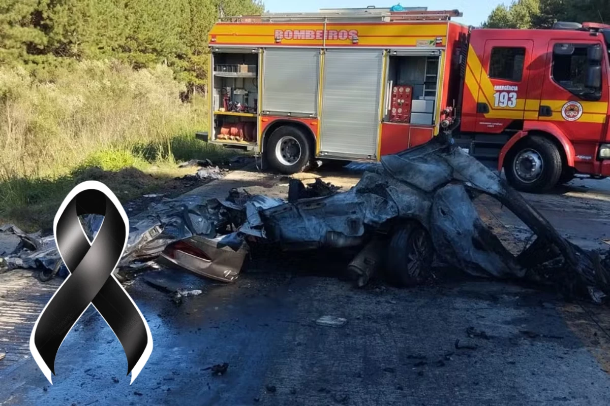 Carro colide frontalmente com caminhão, pega fogo e motorista é encontrado sem vida.