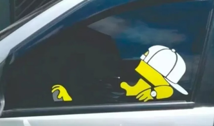 No adesivo, personagens da animação ‘Os Simpsons’ parecem estar dirigindo o veículo; atenção é requerida.