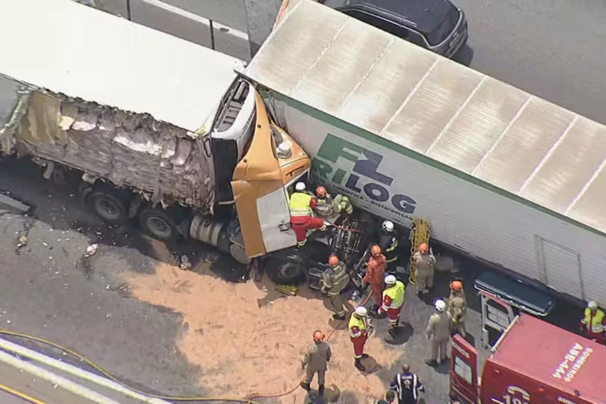 Colisão envolvendo veículos de carga e passeio provocou congestionamento e mobilização de equipes de resgate.