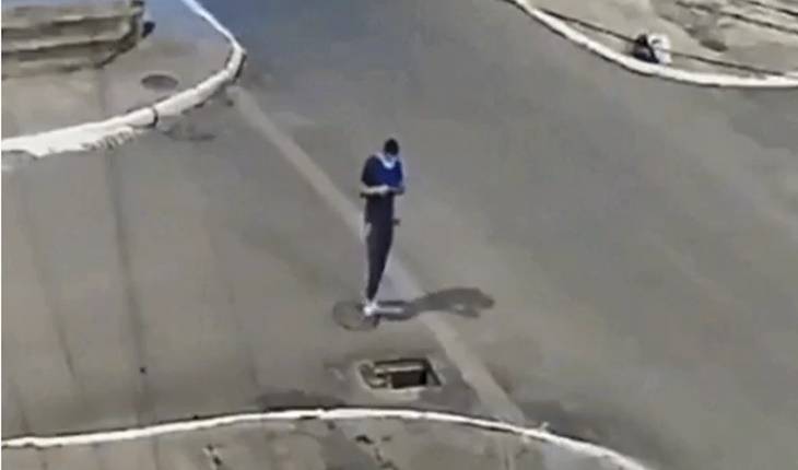 Câmeras de segurança registraram o momento em que homem cai no bueiro.