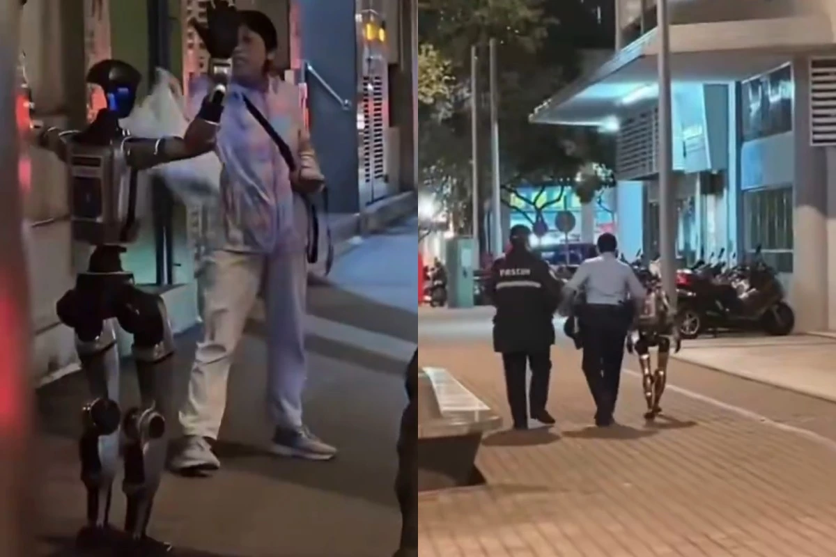 Um robô humanoide Unitree G1 foi preso em Macau após assustar uma idosa na rua; ao ser confrontado, a máquina ergueu os braços.