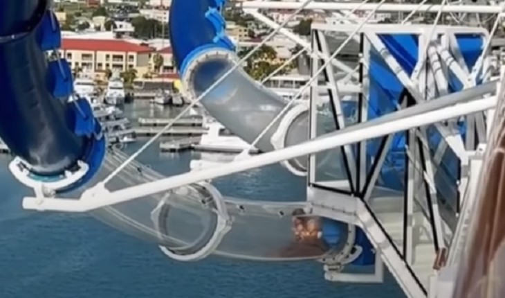 A mulher ficou presa em uma das curvas do brinquedo transparente, quando tentava chegar à piscina..