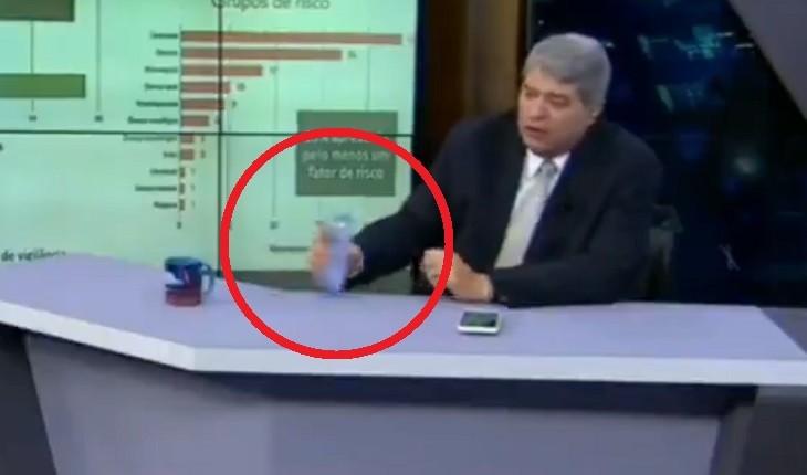 O apresentador do Brasil Urgente estava distraído, mexendo em seu celular, e por pouco não ingeriu o produto errado.