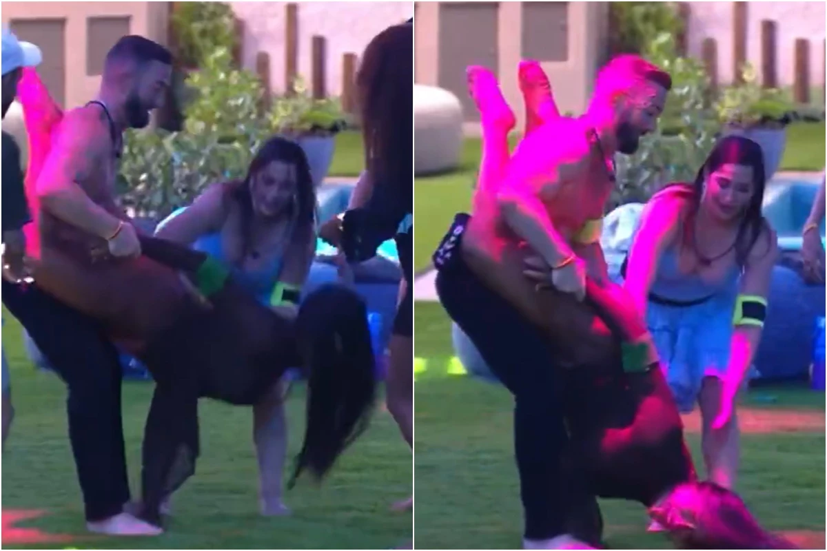 Gracyanne caiu de cara no chão ao ser içada por Diego Hypolito durante festa.
