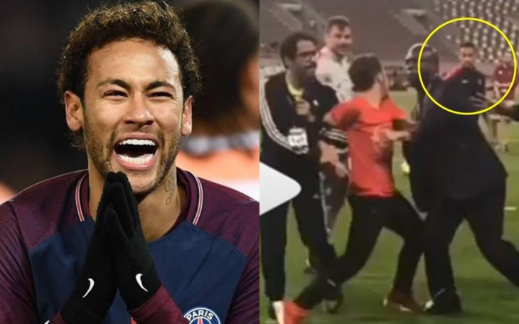 Neymar foi pego de surpresa por um fã que invadiu o gramado em busca de uma selfie.