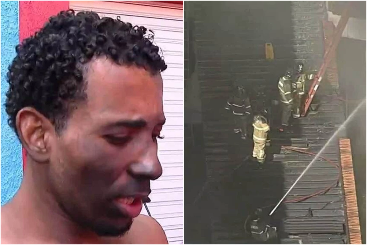 Homem deu entrevista para a TV Globo logo após deixar o galpão com rosto todo sujo de fuligem.