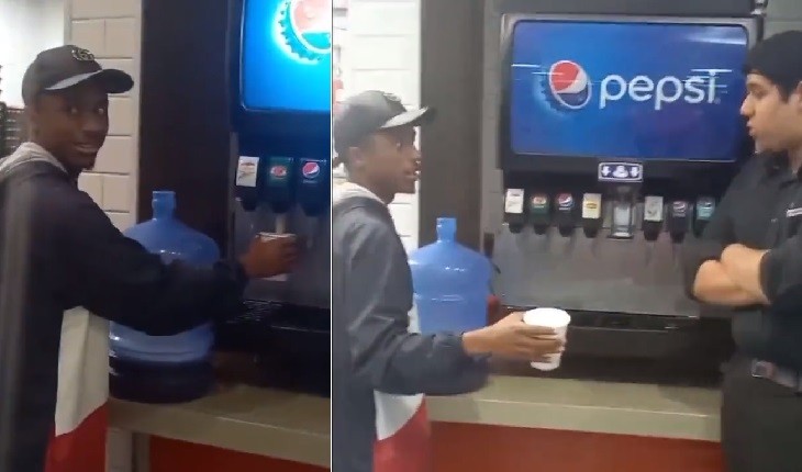 Cliente enche galão de 20L com refrigerante em promoção de fast food de shopping