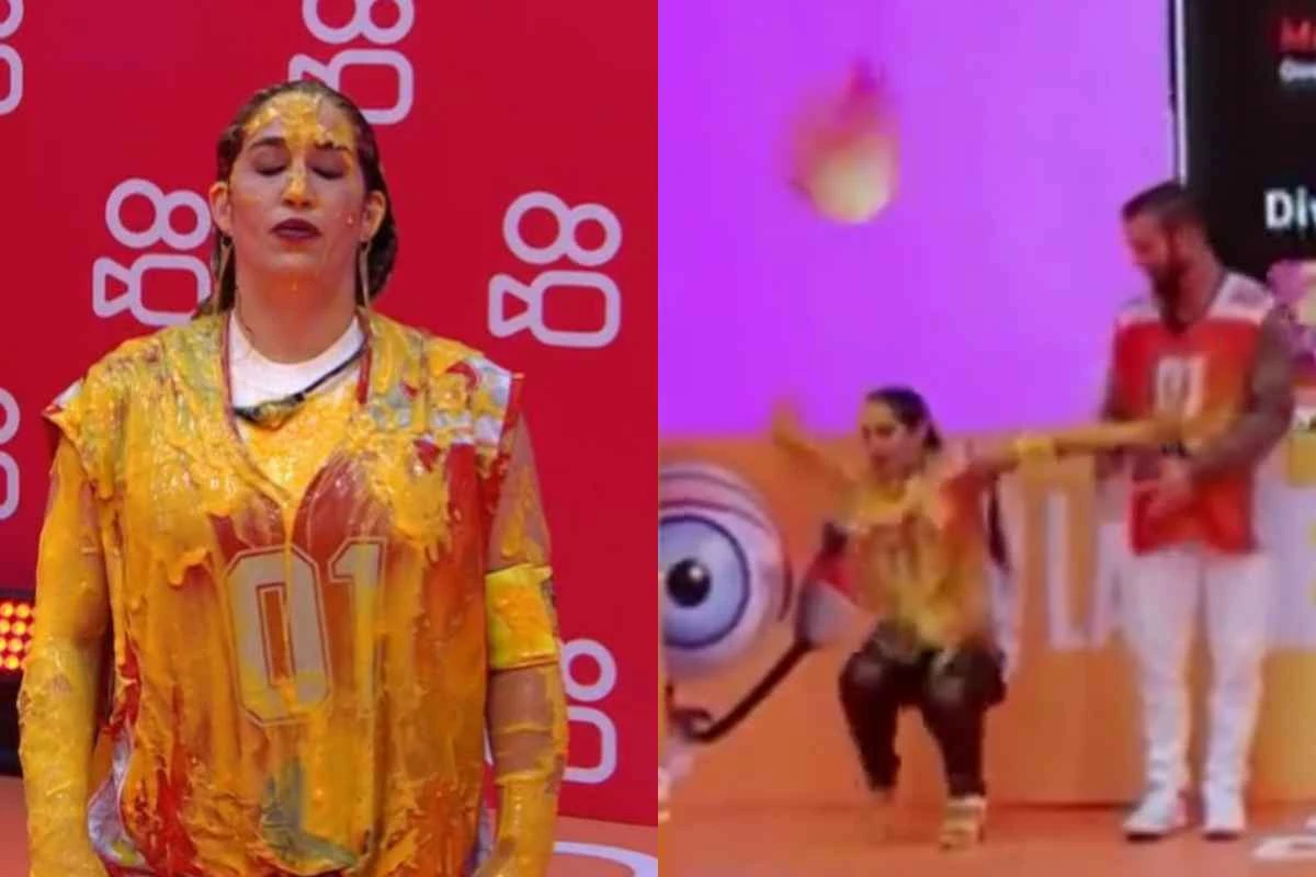 Durante a prova, Daniele Hypolito, de salto, foi atingida por um banho de tinta, ficou toda lambuzada e acabou caindo ao se desequilibrar.