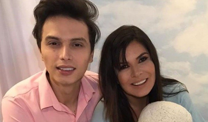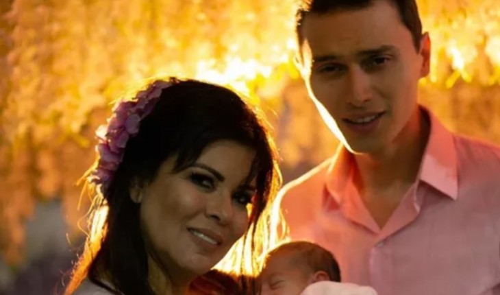 Apresentadora Mara Maravilha mostra o pequeno Benjamin no colo do papai Gabriel.
