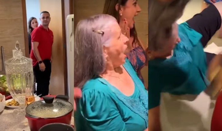 A idosa não suportou a emoção de ver o filho que mora fora do Brasil e desmaiou, contando com a ajuda dos familiares.