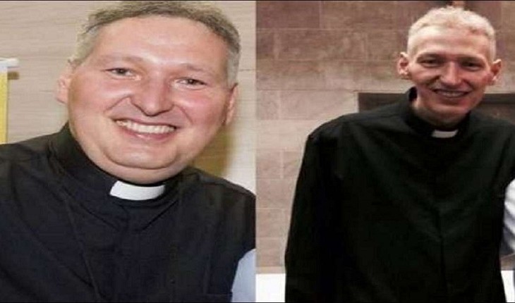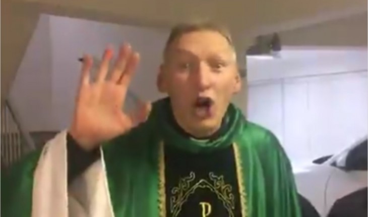 O padre foi empurrado e caiu de uma estrutura com cerca de dois metros de altura, mas felizmente não se feriu.