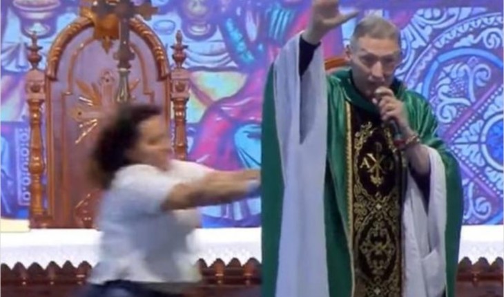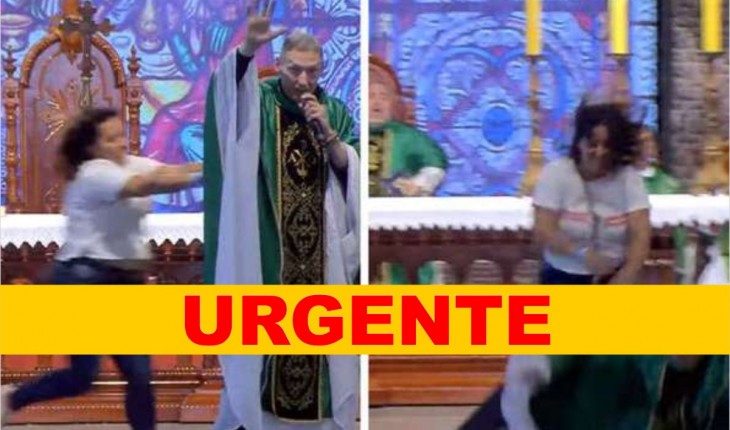 O religioso estava celebrando uma missa quando foi empurrado pela mulher e caiu do palco.