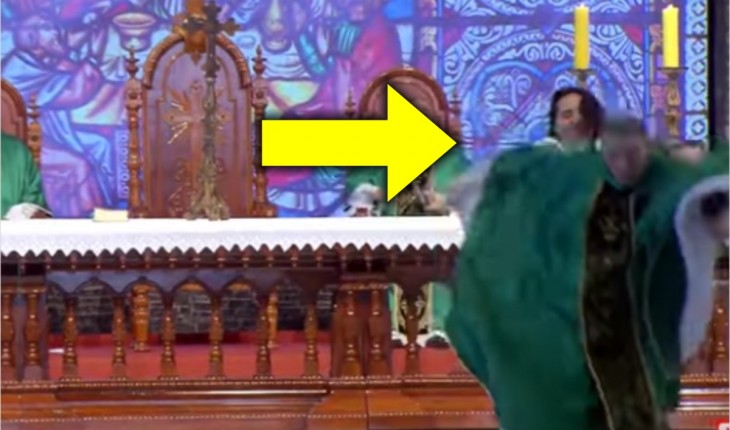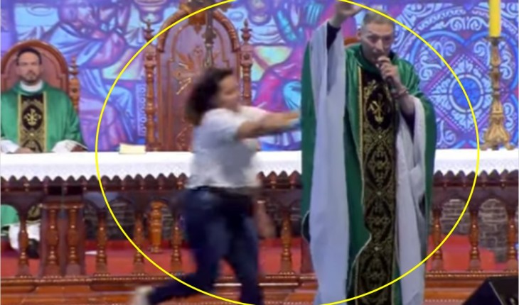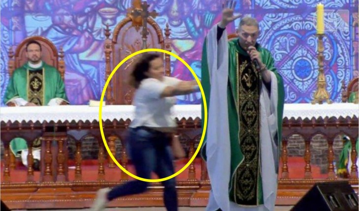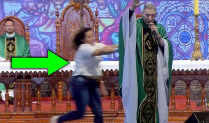 O padre estava falando para os fiéis, quando a mulher apareceu e o empurrou com força.