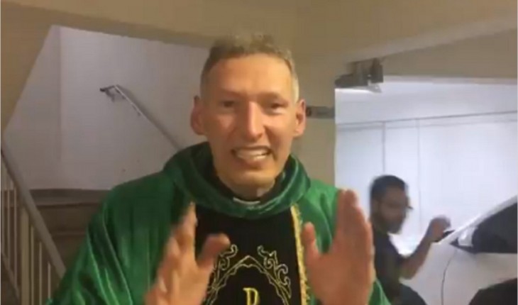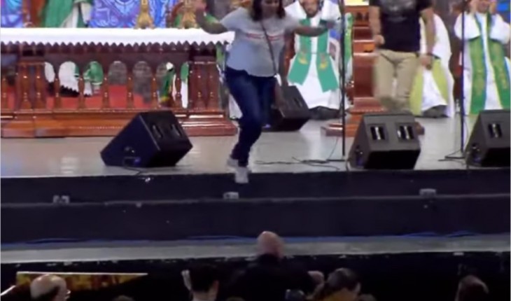 Uma mulher empurrou o padre de cima de uma plataforma com cerca de 2 metros, mas felizmente ele não se feriu gravemente.