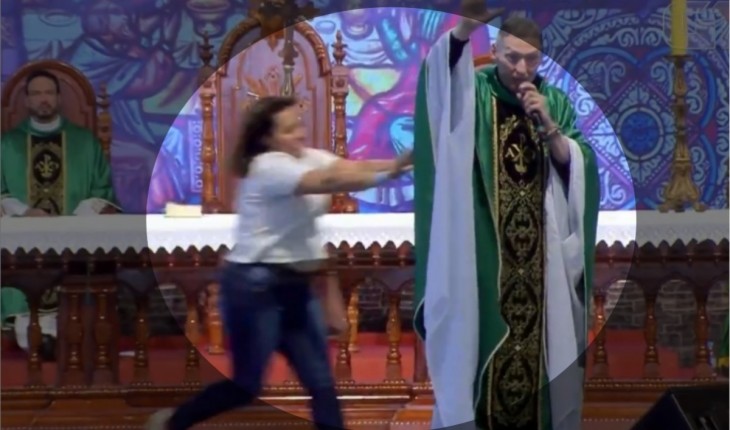 O religioso foi empurrado de cima do palco em que celebrava uma missa, mas não prestou queixa contra a mulher.