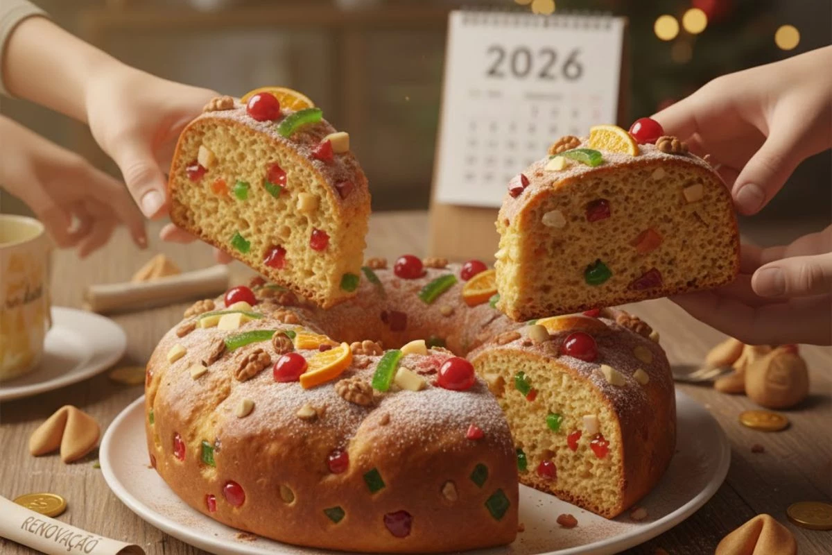 Servir o Bolo da Fortuna é um simbolismo de renovação e de esperança para o início de 2026.