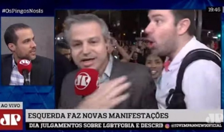 Manifestantes faziam sinal de L com as mãos, enquanto tentavam enxotar repórter da Jovem Pan.