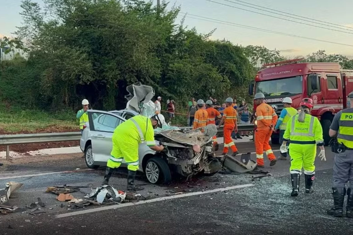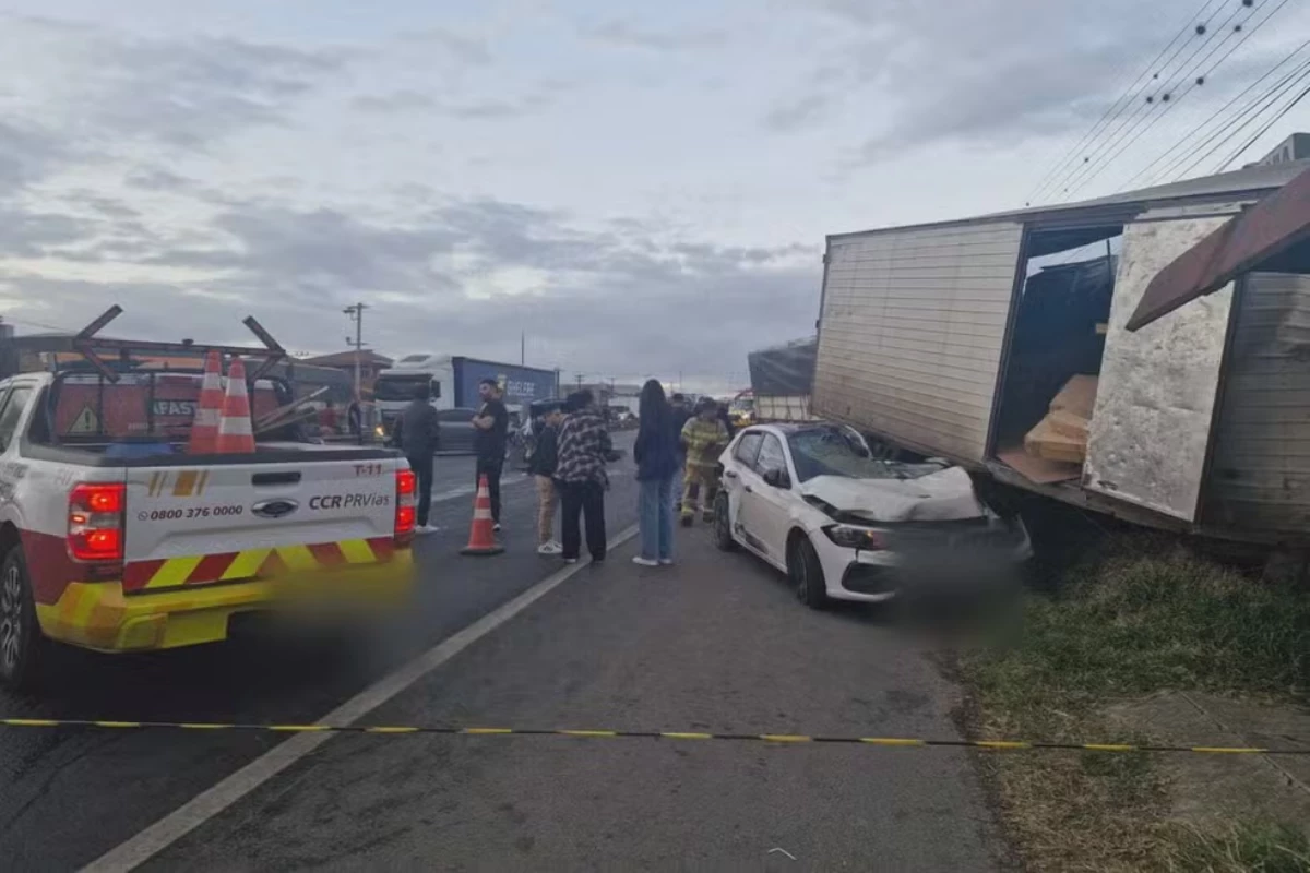 Acidente envolvendo um carro e um caminhão em rodovia no estado de São Paulo.