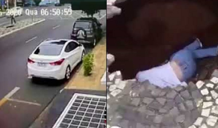 As cenas foram registradas e mostram o momento exato em que a jovem é engolida pelo buraco em Uberlândia.