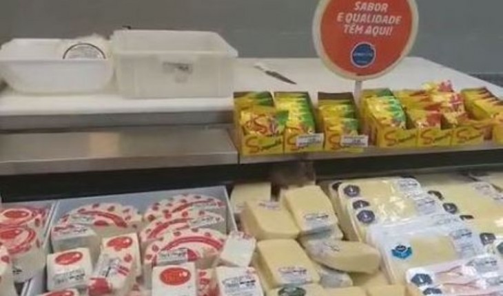 O rato foi flagrado enquando passeava em cima dos queijos de um balcão refrigerado.
