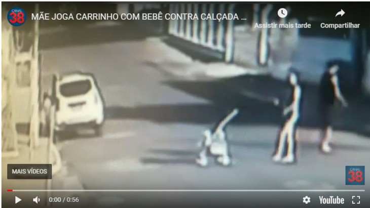 Câmeras de segurança flagraram o momento em que a mulher joga o carrinho com a filha em rua movimentada.